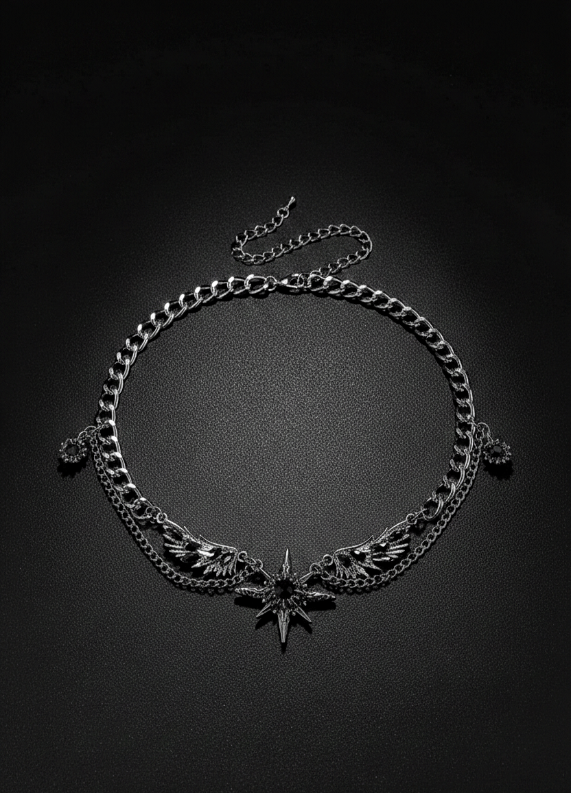 Crafted from premium stainless steel, this necklace features a bold curb-link chain paired with layered fine chains and detailed metal charms. The high-polish finish delivers a sleek, masculine shine while ensuring long-lasting durability and resistance to rust or tarnish. Designed for everyday wear, it adds a strong gothic-street aesthetic to any outfit, making it a perfect statement piece for modern men who prefer edgy, refined accessories.