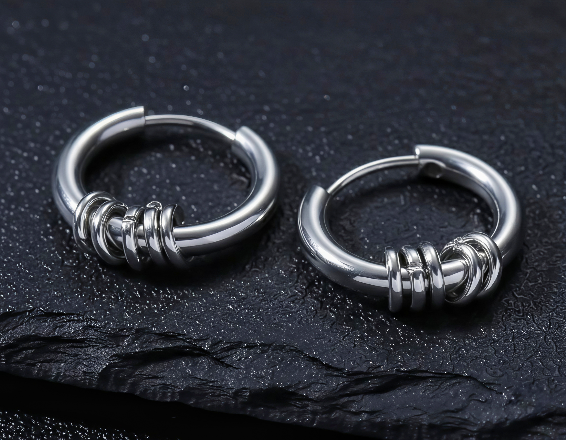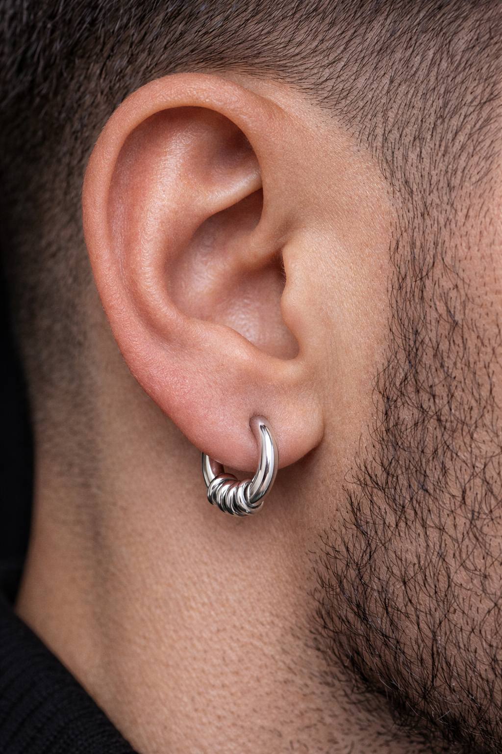 A sleek silver hoop featuring an interwoven twist design that adds subtle edge without overpowering your look. Crafted for everyday wear, this piece blends minimalism with bold masculinity.