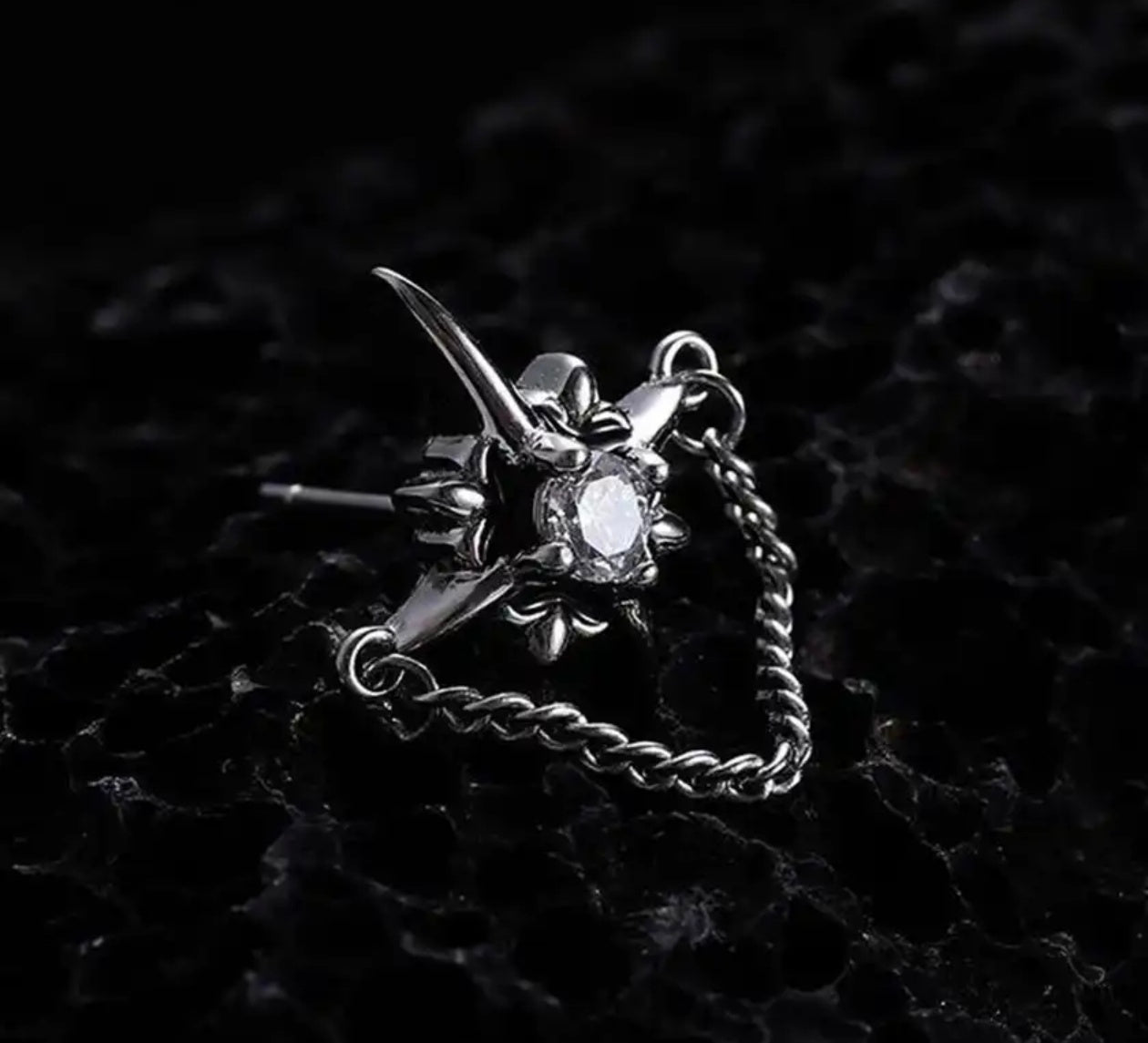 Inspired by celestial forms and architectural edges, this intricately crafted earring blends dramatic structure with brilliant sparkle. The chain detail adds movement and depth, creating a look that feels both rebellious and refined